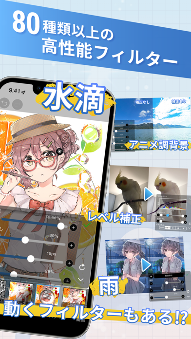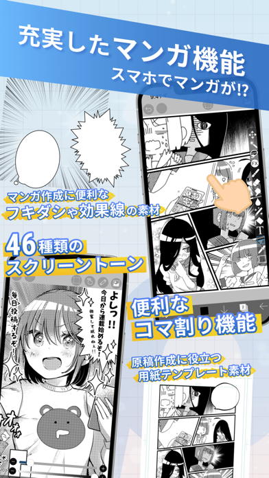 イラストや漫画、厚塗りまでさまざまな2D作品が描けるお絵かきアプリです。手ブレ補正や筆圧感知機能がついており、スマホでの描画にぴったりの環境を用意。またテクスチャやトレス素材などのツールが豊富で、いつでもどこでも本格的な作品制作ができるでしょう。