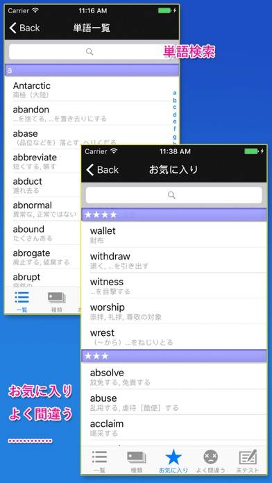 - 単語一覧、テスト、復習モードなどを選んで学習