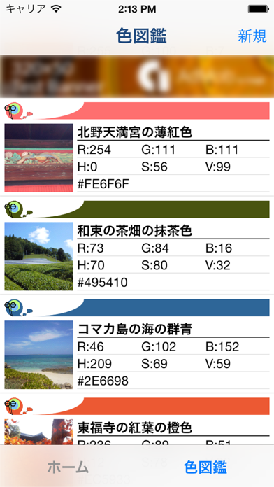 使い方は簡単です。読み込んだ画像の好みの色をタッチして抽出、名前をつけるだけ。するとRGB・HSV・HTML、3つのコードが添えられたカラーカードがあっという間に出来あがり、色図鑑に登録。いつでも確認ができます。