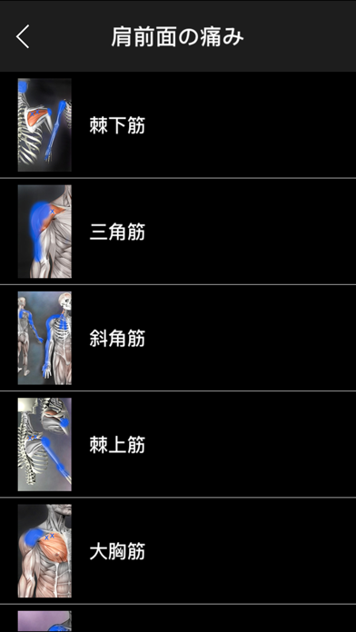 - 人体図や筋肉リストから痛みの原因を部位別にすばやく探せる