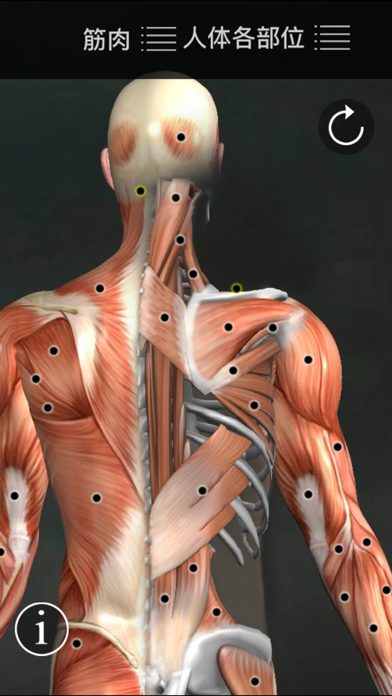 目的の筋肉を探すときは、筋肉名のリストだけでなく、全体図から選ぶ方法もあります。全体図は各部位をズームアップでき、狙った場所をタップしやすくなっている仕様。どのへんが痛むのか、周辺部位からポイントを探ることも可能です。