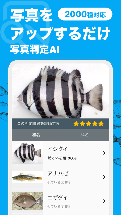 写真を送るだけで魚の種類を教えてくれるアプリ。撮影した画像をアプリに送信すると、AIが解析し、可能性のある魚種を提示してくれます。種だけでなく科のレベルでも情報を得られるため、詳細な識別が可能です。