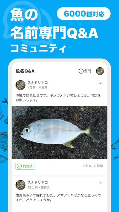 コミュニティ機能もこのアプリの魅力。AIでは特定しきれない魚種も、Q&A形式でほかの利用者が回答を寄せてくれます。閲覧者の投票によって正解が選ばれるため、信頼性も高く、知識を深めたいときに役立ちます。
