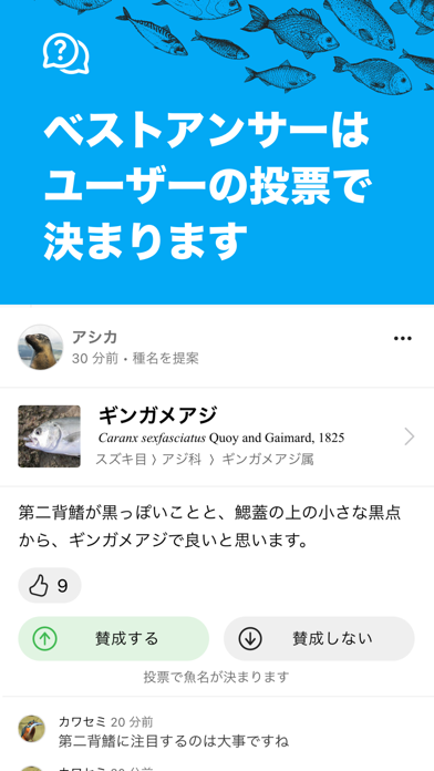 コミュニティ機能もこのアプリの魅力。AIでは特定しきれない魚種も、Q&A形式でほかの利用者が回答を寄せてくれます。閲覧者の投票によって正解が選ばれるため、信頼性も高く、知識を深めたいときに役立ちます。