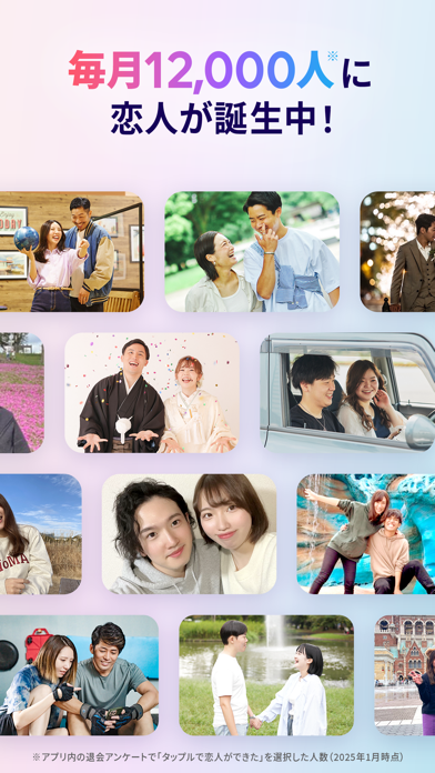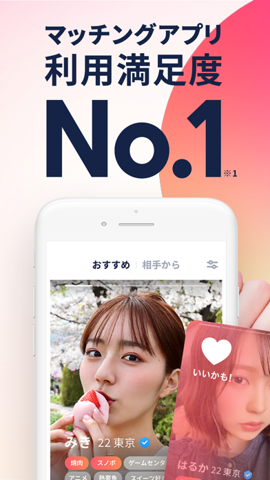 登録者2,000万人を超え、毎月1万人のカップルが誕生するマッチングアプリ。最短24時間以内にデートできる「おでかけ」や、趣味ややりたいことからお相手を探せる「デートプラン」など、気軽に出会いやすい機能がたくさんあります。