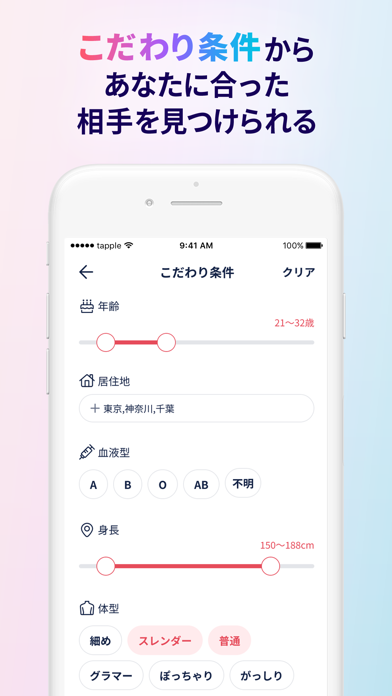 | 主な絞り込み条件 | 年齢、居住地、体型、年収、喫煙の有無、飲酒の頻度、年齢、現在地からの距離、休日、同居人、結婚の時期・意思など |