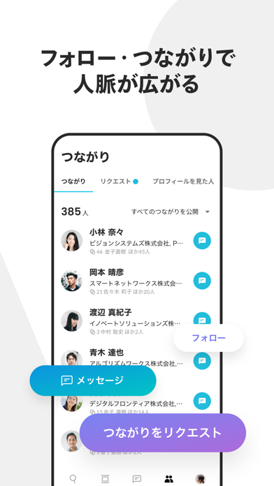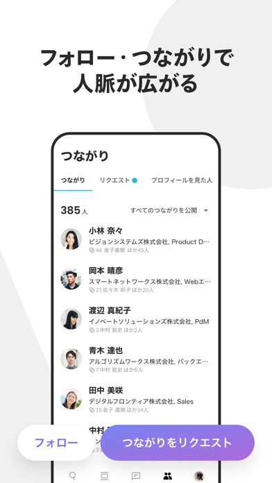 転職や副業を始める前でも、このアプリを通じて企業やチームと気軽に会話ができます。興味を持った企業との対話を通じて、より深い情報を得ることも。企業のカルチャーや雰囲気を事前に理解でき、自分に合った企業を見つけやすくなりますよ。