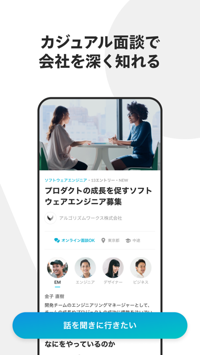 これを使って転職しました。他の求人媒体には登録する気になれなかったのですが、ちゃんと真摯に書かれているコンテンツや、「話を聞きに行きたい」というのがエントリー、って考え方に惹かれました。iPhone版のほうがきれいにできている気がするので、Android版ももっとがんばってほしいです...!