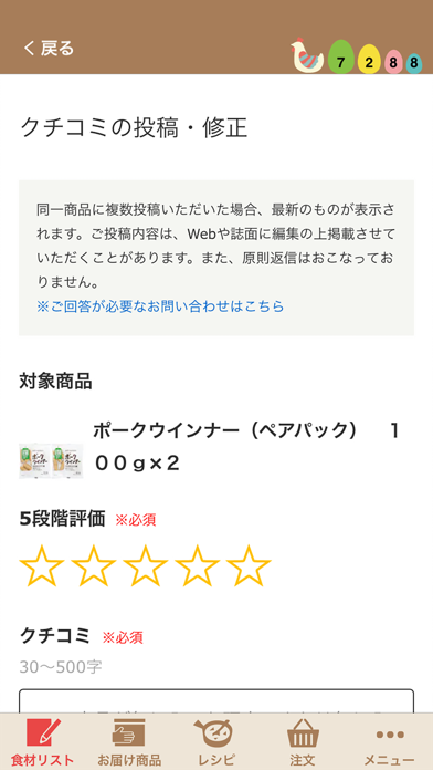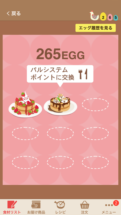 アプリ内での景品交換や、利用代金として使えるポイント制度があります。使いきった食材を削除したり、クチコミを投稿したりすることで、“エッグ”というアプリ内のポイントが貯まる仕組み。“100エッグ”ごとにパンケーキなどのアイテムと交換可能です。