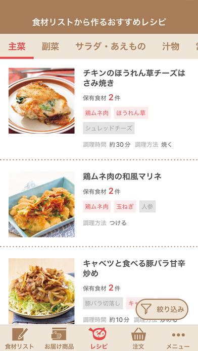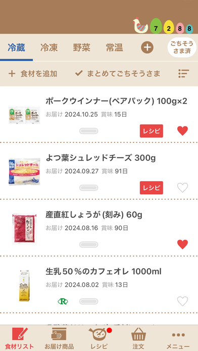 注文した食材は、お届け日に自動でリストに追加されます。食べきった食材はリストから削除して管理できるので、残っている食材を確認しやすい仕組みです。消費期限アラート機能がついており、食品ロスの防止につながるでしょう。