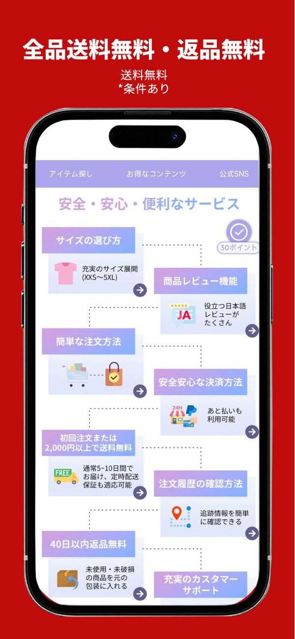 返品無料や電話でのカスタマーサポートなど、お買い物をするためのサポートが充実。40日以内なら返品無料なので安心してお買い物ができます。配送状況も追跡。困ったことがあったらカスタマーサポートに電話をしてその場で解決できます。
