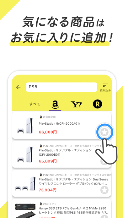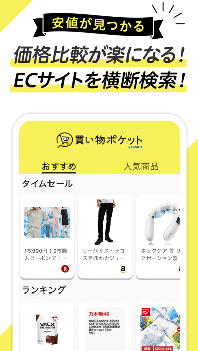 ショッピングサイトにある商品の価格を比較できるアプリ。商品名を入力すると、Amazon・Yahoo!・楽天から検索結果を表示してくれます。