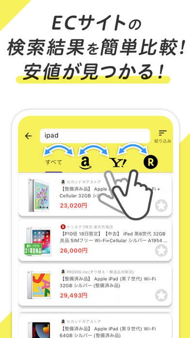 ショッピングサイトにある商品の価格を比較できるアプリ。商品名を入力すると、Amazon・Yahoo!・楽天から検索結果を表示してくれます。