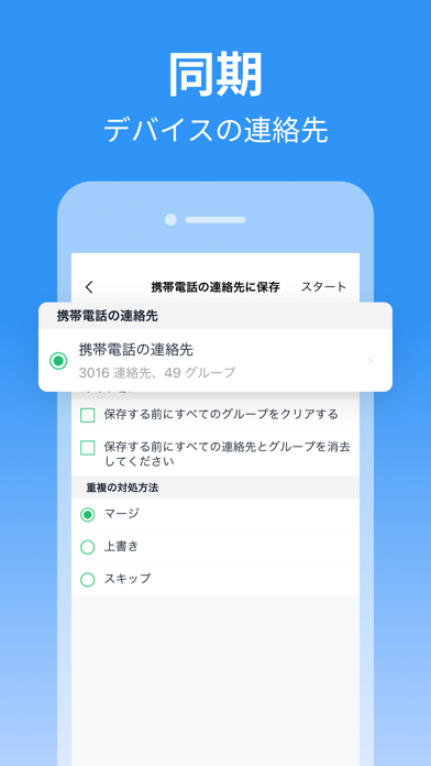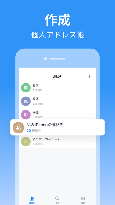 連絡先はグループにわけて管理可能。仕事やプライベートで連絡先を分類したり、端末ごとの連絡先をわけて登録したりできます。用途や目的ごとに連絡先を分類して管理しておけば、データのインポート作業がやりやすくなります。