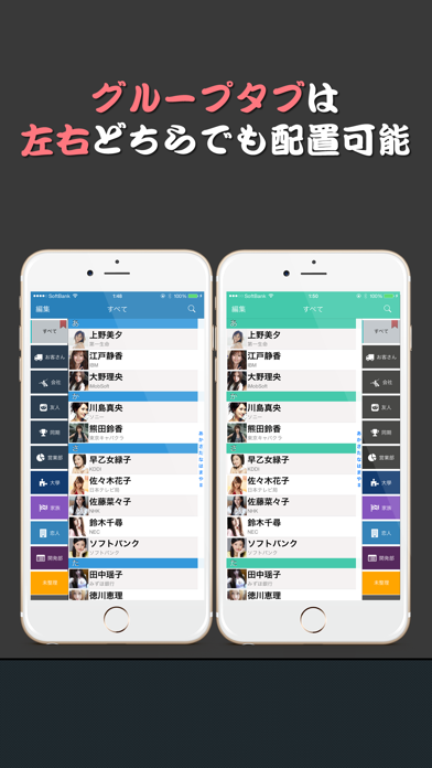 他の電話帳アプリと比べて快適な操作感と、グループへのスムーズな連絡機能が特徴。会社やサークルなど、グループとの連絡が多い方には特に便利なアプリです。アイコンや色分けの設定もでき、たくさん登録しても見分けやすいデザインもGood。