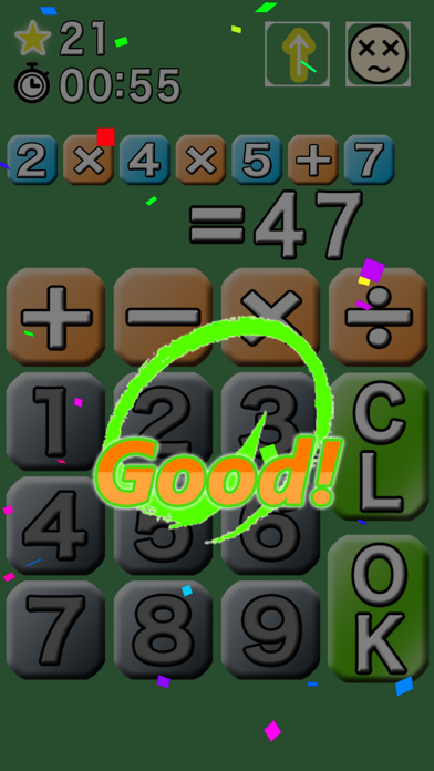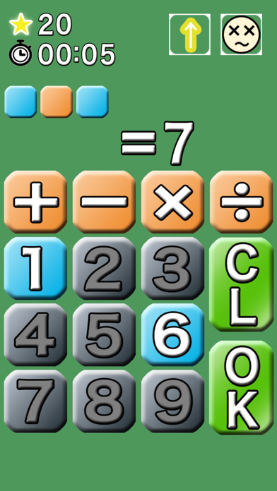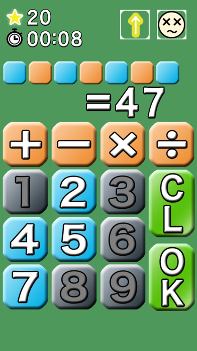 画面には数式の答えが表示されていますので、式が完成するように数字と記号を選びます。式に使える数字以外は灰色で表示されますので、色のついた数字だけで式を完成させなければなりません。数字、記号、数字という順に画面をタップして式をつくりましょう。