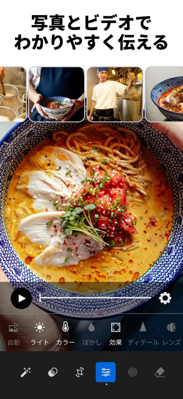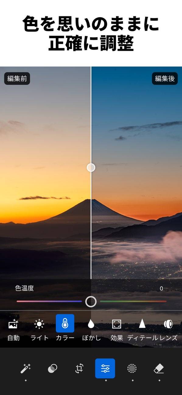 PCソフト『Adobe Lightroom』のアプリ版。超本格的な写真加工が手軽に行えます。PC版との連携が可能で写真編集だけでなくデータの共有もできます。