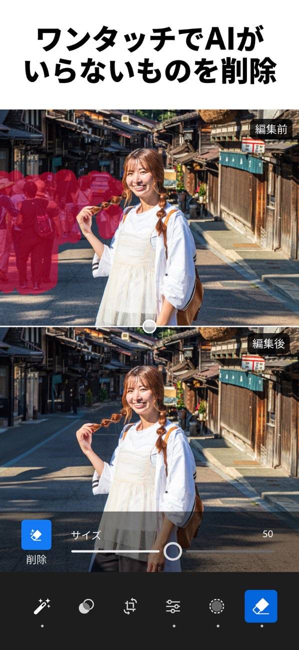 - 直感的な操作で、写真に写り込む不要なものを簡単に消せる