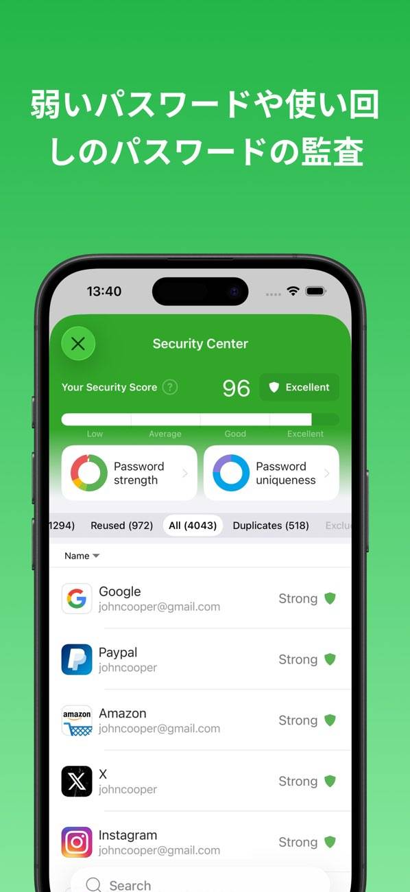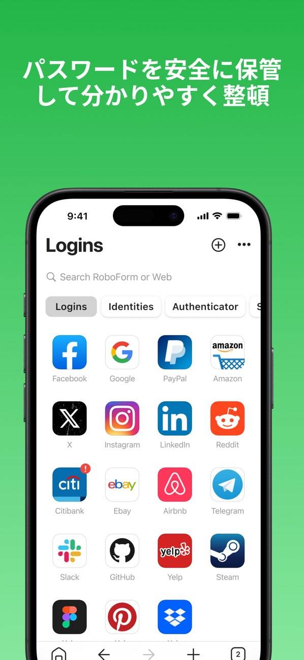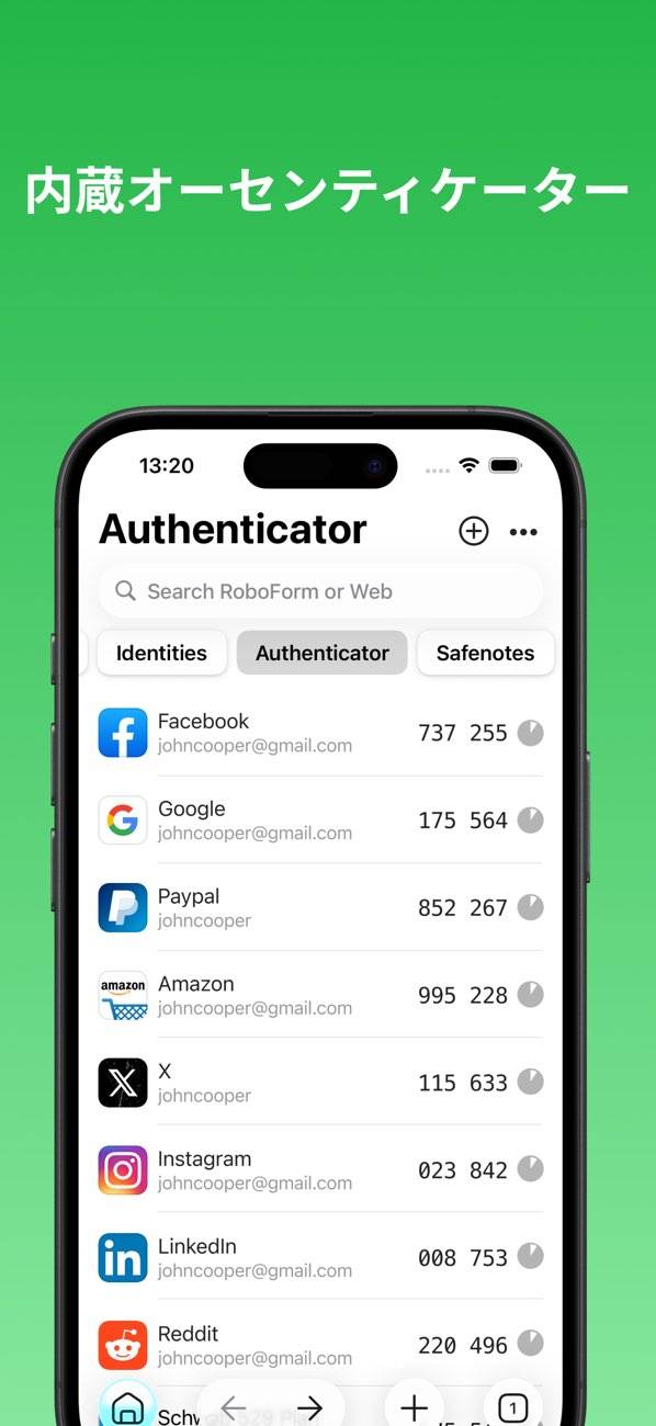 ユーザーの全てのパスワードを一箇所で安全に管理します。最大の特徴は、強固なパスワードを生成し、自動的に各ウェブサイトでのログイン情報として保存できること。デバイスを問わず、あらゆる場所でパスワードに簡単にアクセスできます。また、信用情報や個人的なメモまで、大切な情報を全て保管可能。
