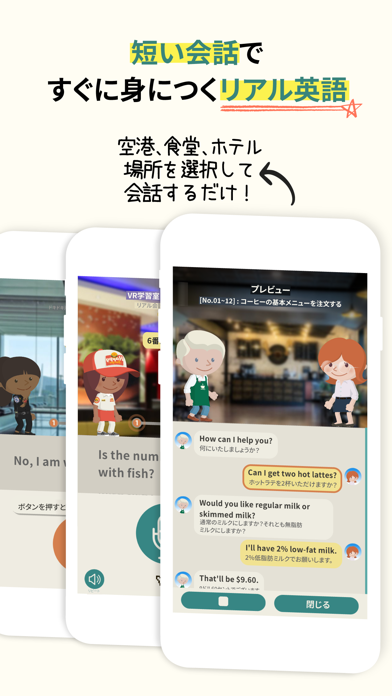 シチュエーション別の学習コースが選べます。ビジネス英語や旅行先での会話など、どれも実用的な英語を学べるのが魅力。1コース6問程度なので、隙間時間にさっと学習ができます。
