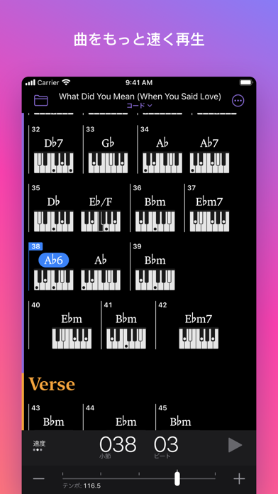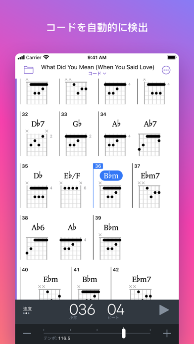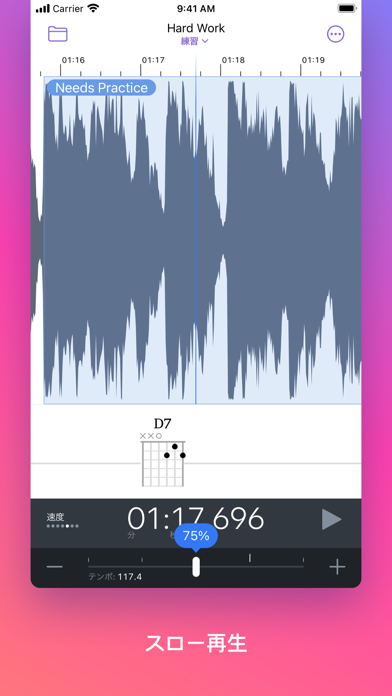 自分の持っている音源を使って、楽譜やTAB譜がなくても演奏練習が可能。検出されたコード進行を参考にしながら再生スピードを落としたり、演奏したいパートだけを残したりして耳コピに集中できます。ピアノやギターなどのコード図も表示できるため、楽譜が苦手でも楽しく練習を進められますよ。
