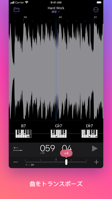 曲を読み込むと、コード、ビート、キーなどを自動で解析して画面に表示。特定の楽器やボーカルをミュートしたり、ループ再生で難しい部分を繰り返し聴いたりと、採譜に必要な作業をスムーズに進められます。直感的な操作で音を分解できるので、歌やギターソロのフレーズを捉える耳をじっくり育てることができます。
