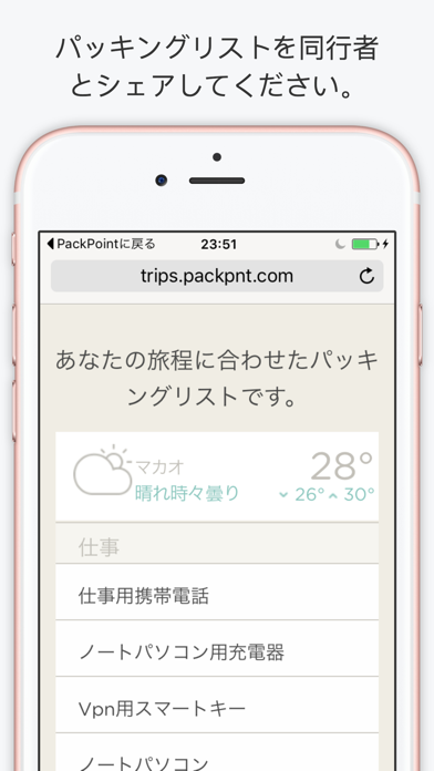 性別や滞在日数、旅先でやることを設定すると、必要な荷物を提示してくれます。当日の天気予報も表示されるのがポイント。雨の予報であれば折り畳み傘、日差しが強い日であれば日焼け止めなどもリストアップしてくれます。