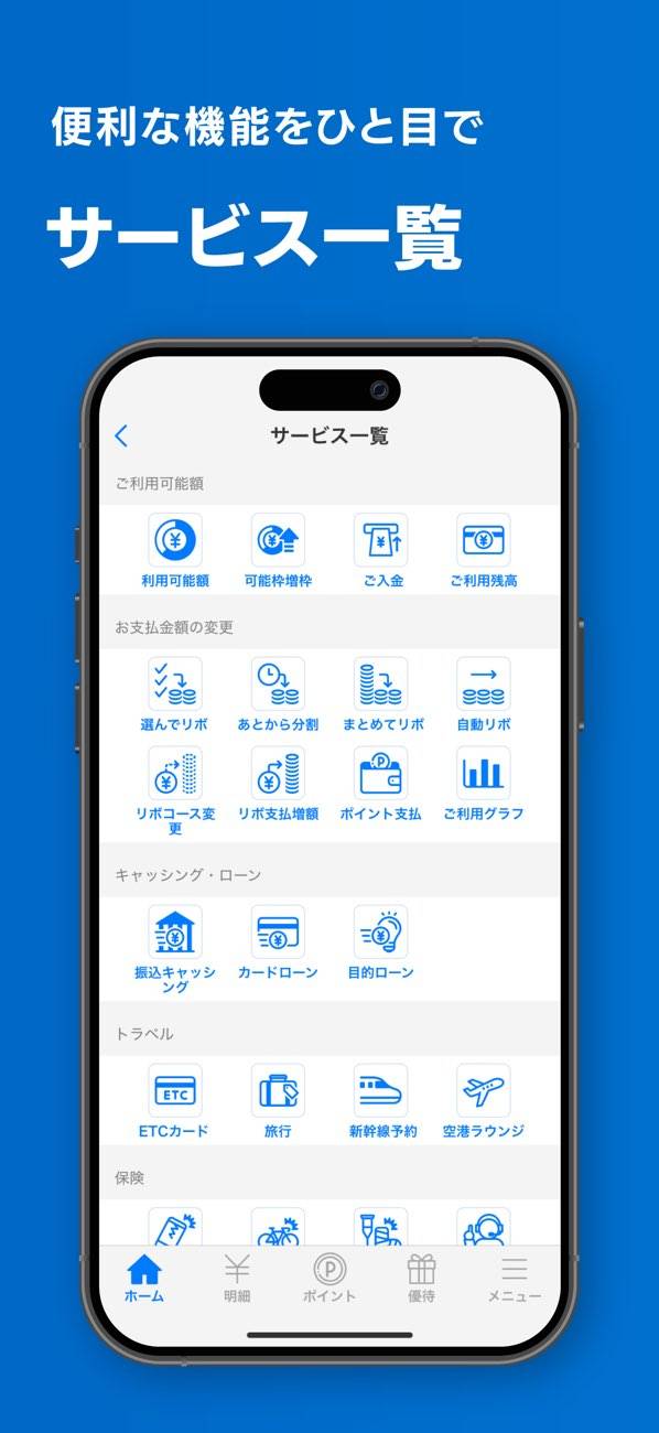24時間いつでもカードの利用状況とポイントが確認できる便利なアプリ。Touch IDやFace IDを使って安全にログインし、複数枚のカードもまとめて管理が可能です。さらに、新鮮なキャンペーン情報や特典も提供。お得にカードを使いたい方や、複数カードを持つ方にピッタリのツールでしょう。