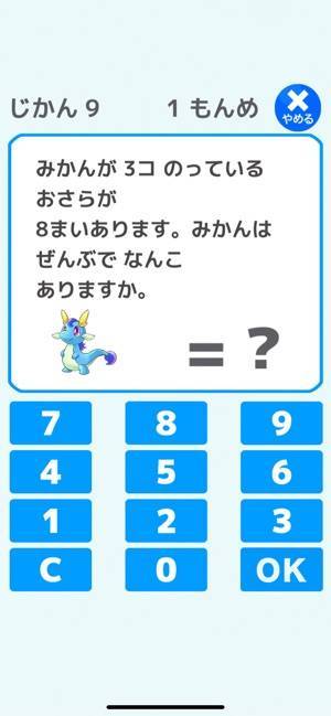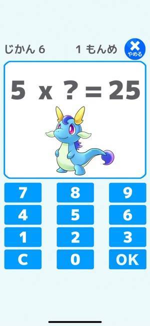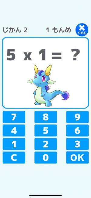 数字パッドで、出題されたかけ算を解いていく計算アプリ。”○の段”ごとにタイムが計測され、早く正確に学べるようになっています。また数回チャレンジしないとモンスターをGETできない仕様になっており、覚えやすいのが特徴です。