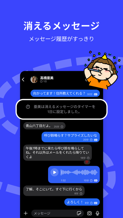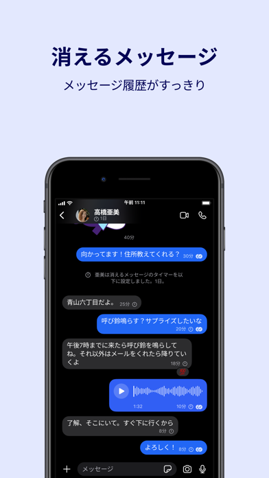 特定の時間が経つとメッセージが自動で消える機能があります。これにより重要な情報が後に残らないように設定可能。一時的なやりとりを行う際に最適で、万が一スマホを落としてしまった場合でも安心です。特に秘密を共有したいときに重宝するでしょう。