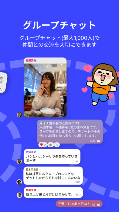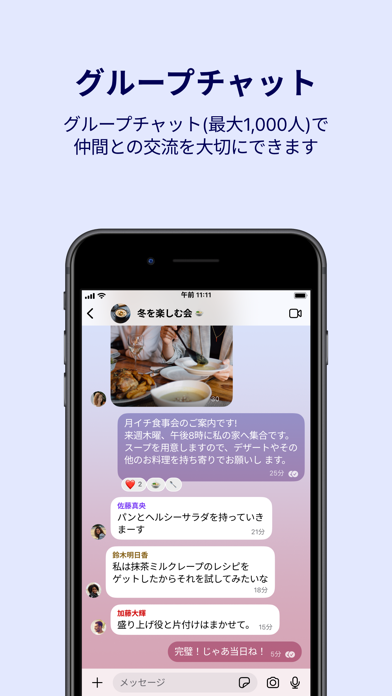 多くの人が参加するグループチャットにも対応しています。管理者権限でメンバーをコントロールできるため、情報共有が効率的に行えます。また不要な投稿を防ぐこともでき、組織やコミュニティに最適。複数の仲間との情報共有に活用できます。