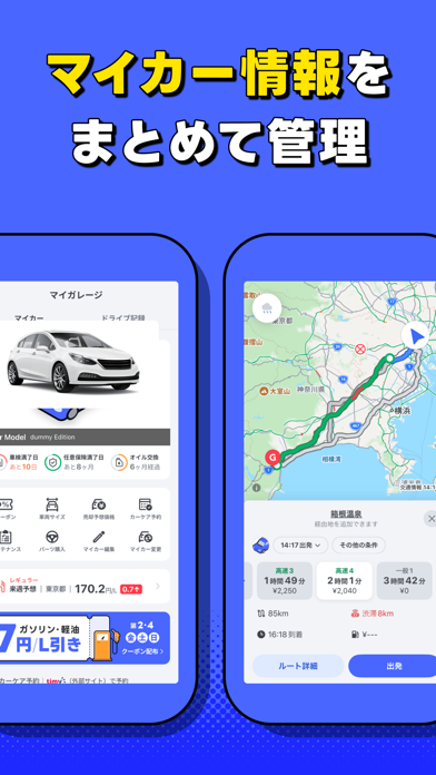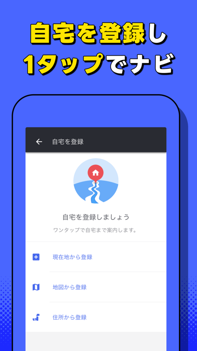 目的地までのルート検索と案内ができるカーナビアプリ。ルートは複数の候補から好きなものを選べるので、快適に目的地まで走れます。