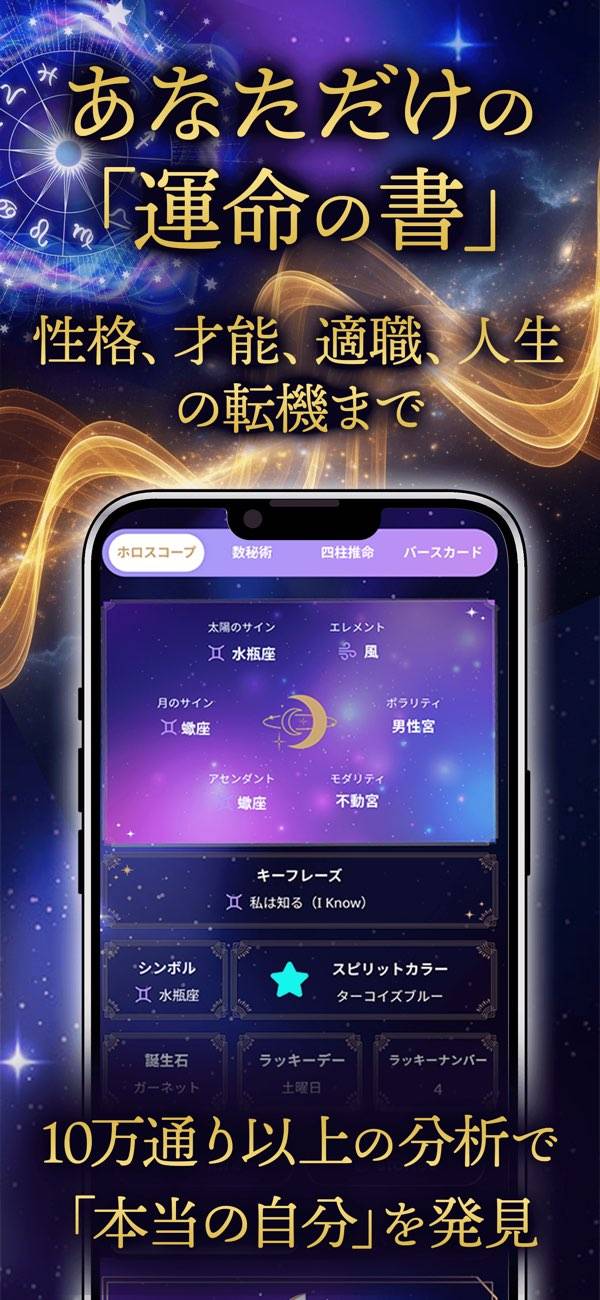 名前の響きをもとに運命を占います。一般的な占いが画数や字そのものから判断するのに対し、このアプリでは名前の「言霊部分」に着目します。名前の音に込められた特性や意味を解き明かし、自分の人生にどのような影響を及ぼすのかを知れるでしょう。