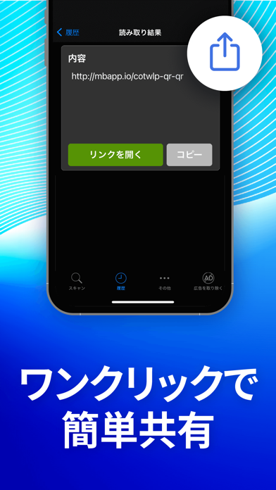 オーソドックスなタイプのQRコードリーダー。アプリを起動するとQRコードの読み取り画面が表示され、すぐに読み取りを開始できます。読み取ったQRコードは「コピー」または「リンクを開く」が選択できるので、用途に合わせて使い分けるといいでしょう。