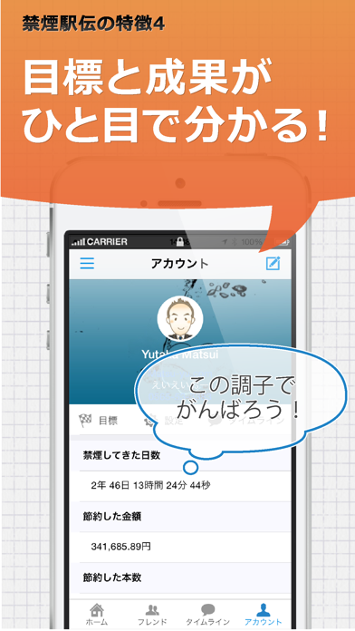 禁煙仲間と励ましあいながら、禁煙を目指せるのが本アプリの大きな強みです。「フレンド」や「タイムライン」のタブから、禁煙を目指すユーザーとつながりを持てます。タイムラインで禁煙を頑張っている仲間を見れば、あきらめずに頑張れるのではないでしょうか。