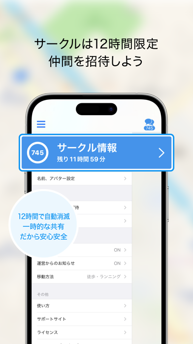 本アプリはメンバーのアバターが地図に表示されるので、一目で把握できます。メッセージの送信も簡単にできますよ。