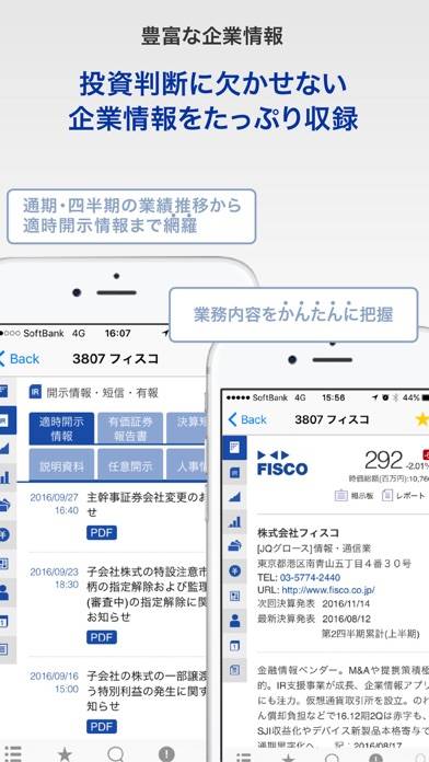 投資家向け情報アプリとして情報量は申し分無く、テーマ、スクリーニング機能なども含めてよくできている。