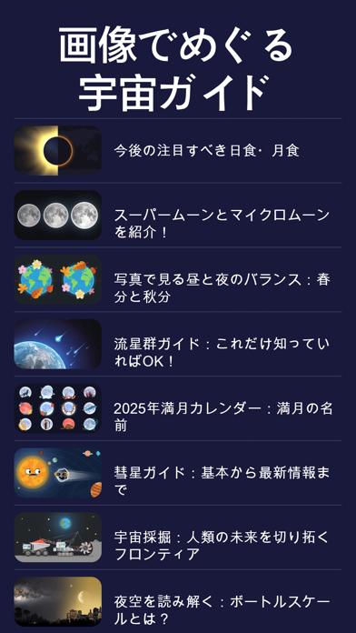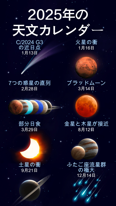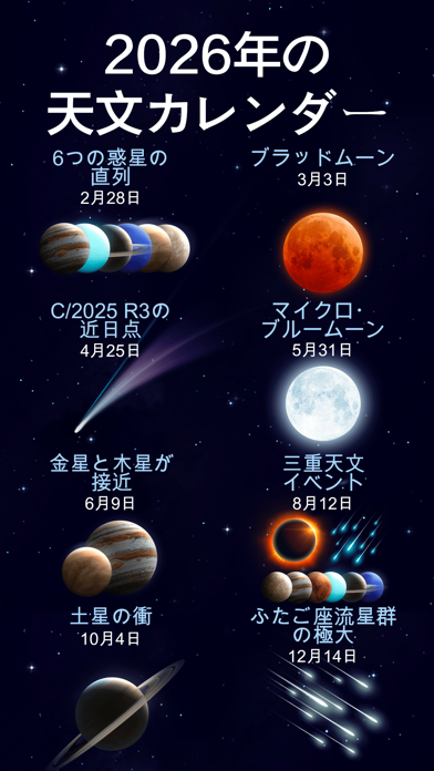 - 日時を設定すると未来や過去の星空を観察できる。日蝕&月蝕も再現
