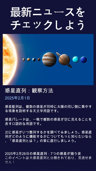 ▲ニュースでは、今夜観測できる惑星や星座を画像付きで表示。日本では聞き慣れない星座も収録されている。