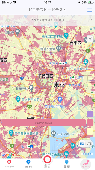 本アプリは、マップ上に表示した地域の回線速度の平均値をチェックできます。自分の回線速度が速いか遅いかを判断する便利な基準ですが、これはあくまでもドコモの5GとLTEとの比較です。ほかのキャリアは比較できません。Wi-Fiに関しては、ドコモ光もないので残念です。