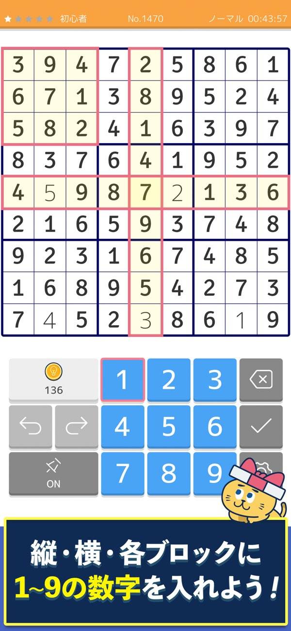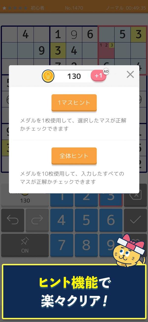 クラシックなルールのナンプレが、ヒント付きで遊べます。マスをタップして数字を入力していくだけのシンプルな操作感で、遊びやすいのが魅力。またクリアするたびに応募ポイントがもらえ、現金、電化製品、飲食店などで使えるクーポンがもらえる懸賞に参加できます。