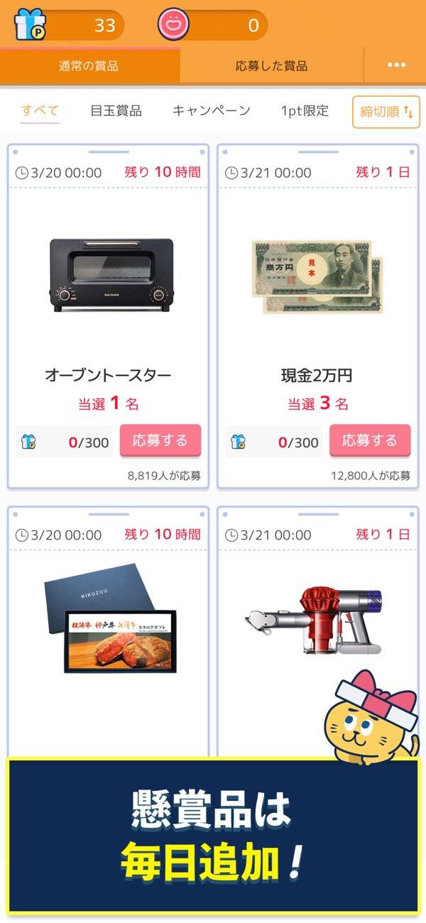 - 問題を解いて応募ポイントゲット。豪華景品が当たる懸賞に応募できる