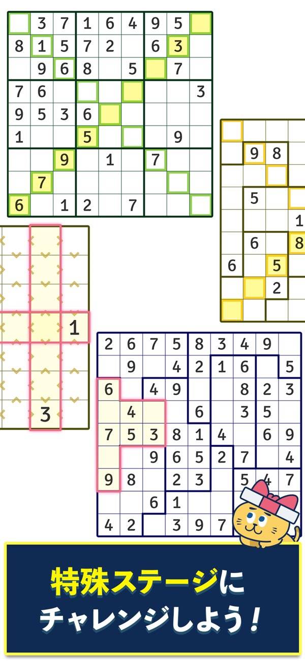 通常のナンプレだけでなく、クロスやジグソーなど変則的な問題と難易度レベルで毎日違った楽しみができます。