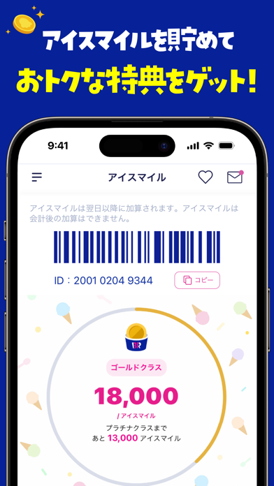 アイスマイルを貯めることで特典を受けられます。お店に行ったときにバーコードをかざすと、ポイントであるアイスマイルが貯まります。1円につき1アイスマイルで、貯めたポイントに応じて特典を利用可能です。