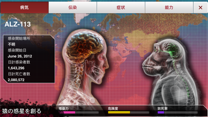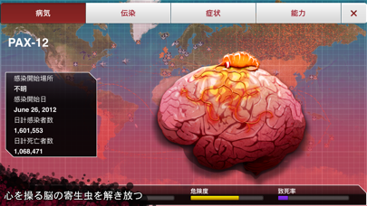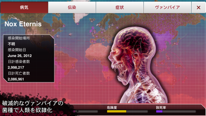 このアプリは、我々人類を凶悪な殺人ウイルスで死滅させようというアプリです。設定がなかなかグロイですけどなれれば楽しいです。人類もしっかりと薬を作って抵抗します。気付かれないようにこっそりと全人類の体をウイルスで蝕んでいきましょう?!