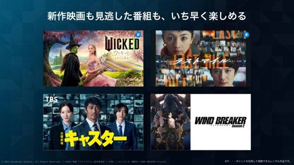 | 作品ジャンル | 洋画、邦画、海外ドラマ、アジアドラマ、国内ドラマ、アニメ、キッズ、ドキュメンタリー、音楽、バラエティ |