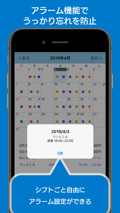複数のシフトを、色分けして分かりやすく管理できるアプリです。バイト先ごとに色分けしてカレンダーに登録できるから、ダブルワークの人にもぴったり。