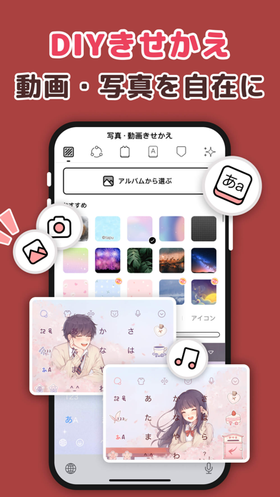 本アプリには、多種多様なキーボードのテンプレートが準備されています。気になったものを選択するだけで、着せ替えができるため手軽。「アルバムから選ぶ」を選択すると、カメラフォルダー内の写真をキーボードの背景に設定できます。