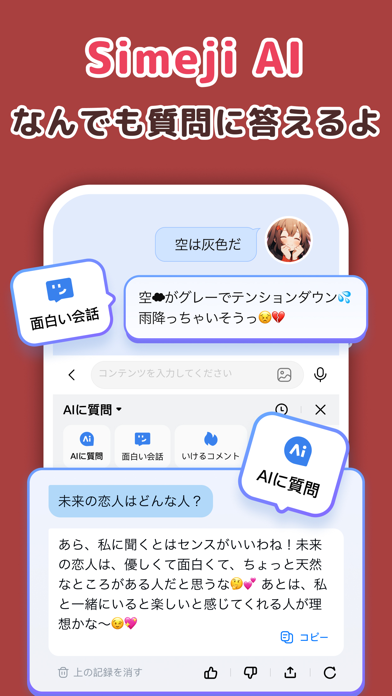 感情の機微を表現できるオリジナル顔文字を20万語以上搭載している他、最適な返事や顔文字の装飾など豊かな表現を提案してくれる「SimejiAI」や、画像生成AIを活用し、被写体の写っていない部分を自動的に補完してくれる画像自動補完機能もあります。