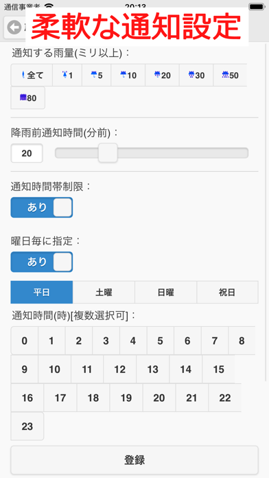 - 降雨前30分以内に通知設定しておけば、高精度の降水予測が可能に